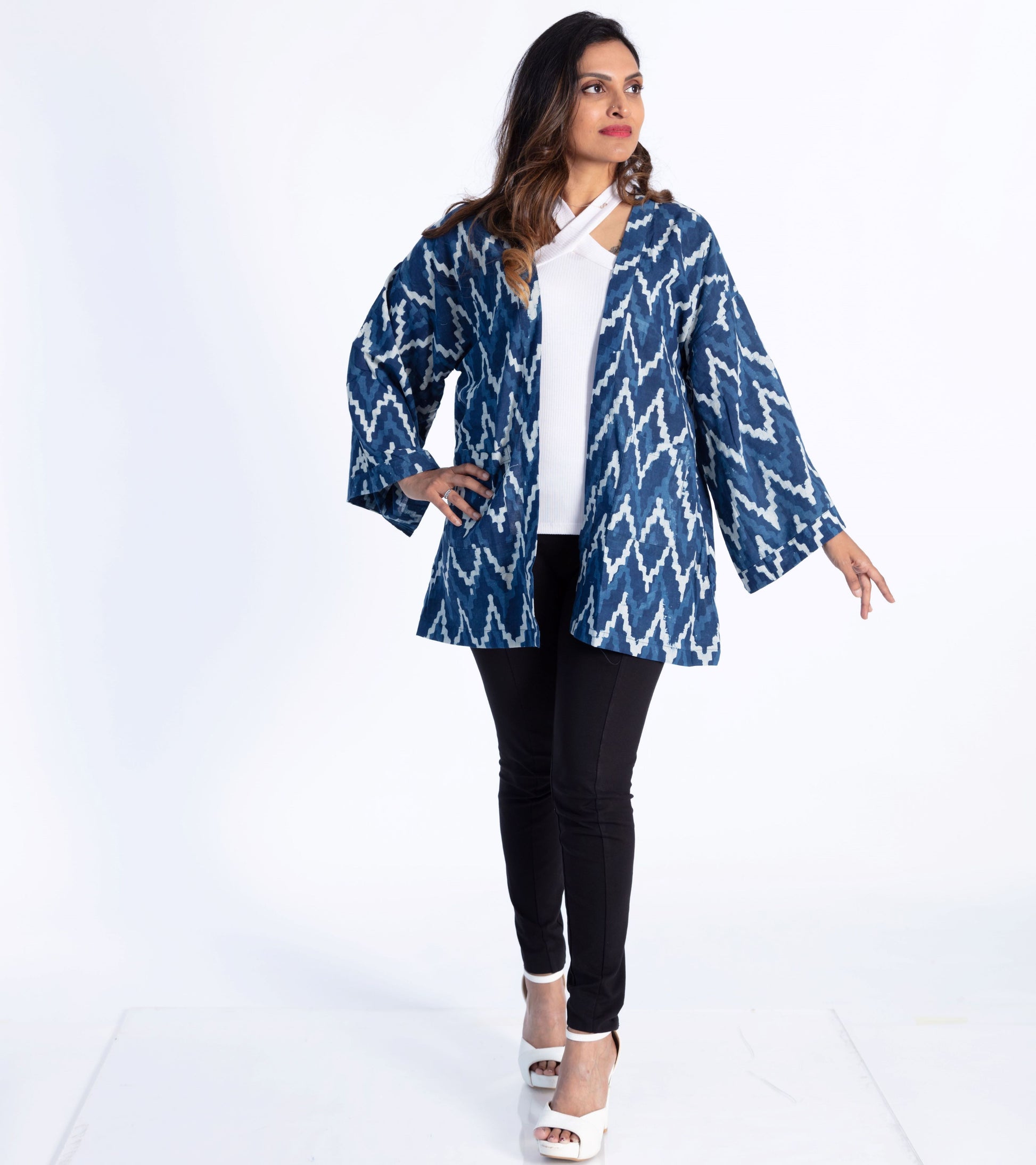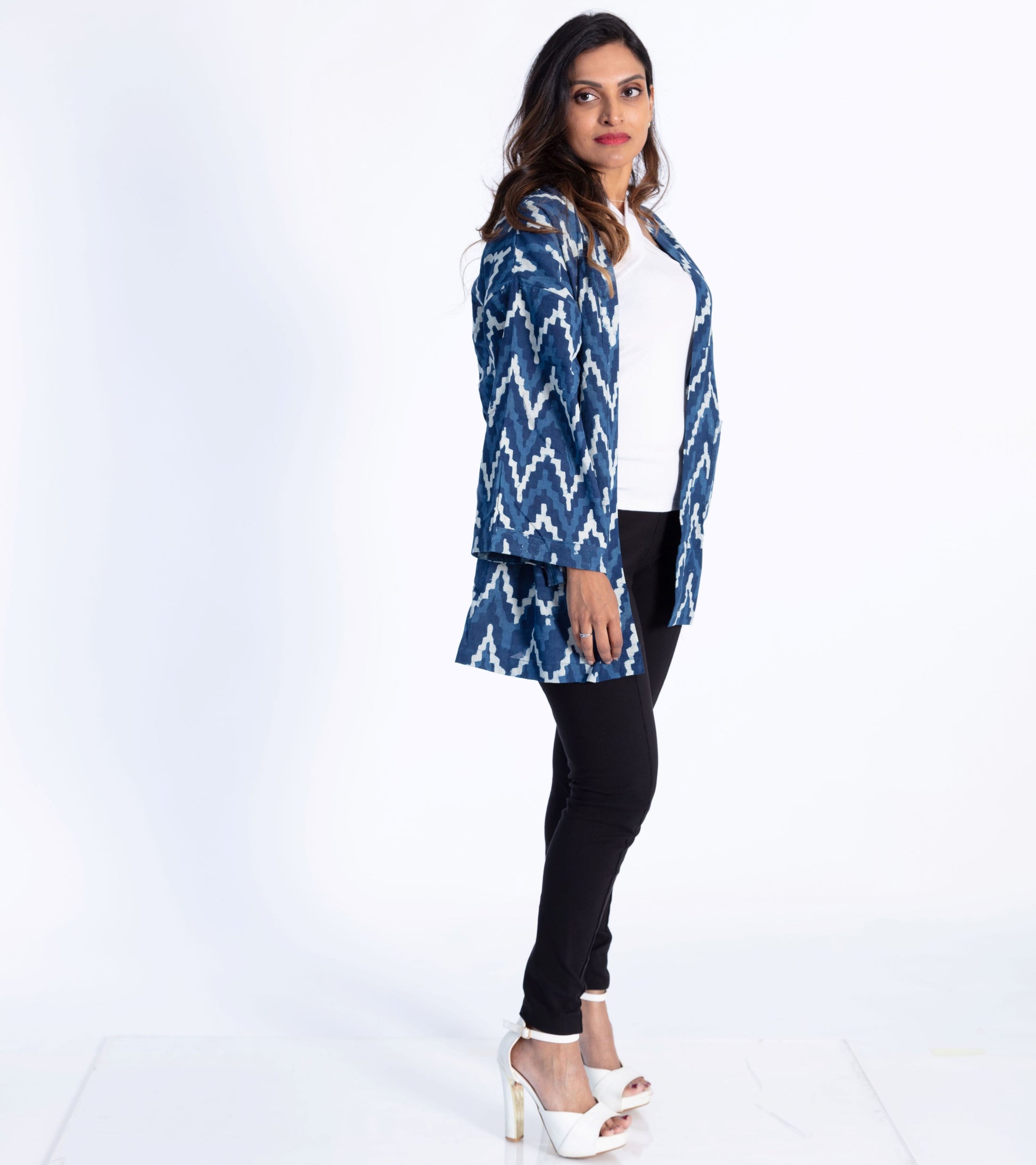 Transform your wardrobe with our stunning zigzag indigo printed shrug, the perfect blend of comfort and versatility. This stylish piece is a must-have addition for every fashion-forward individual!